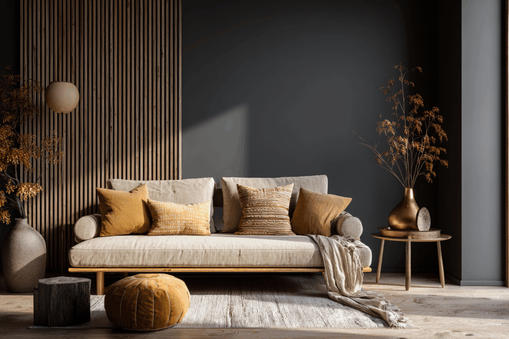 Za sodobne prostore vam priporočamo zimski trend v modernem japandi stilu: kombinacijo hladnejših sivih in antracitnih odtenkov, ki jih uravnotežimo s toplimi karamel, bež in žafran rumenimi poudarki. Takšna paleta ustvarja čist, minimalističen in moderen videz, hkrati pa ohranja prijetno toplino, ki je v zimskem času še posebej vabljiva. Gladke stenske površine, kovinski detajli, leseni elementi in mehki tekstili prostoru dodajo eleganco, udobje in harmoničen ambient, ki združuje sodobnost z naravno toplino zemeljskih barv.
